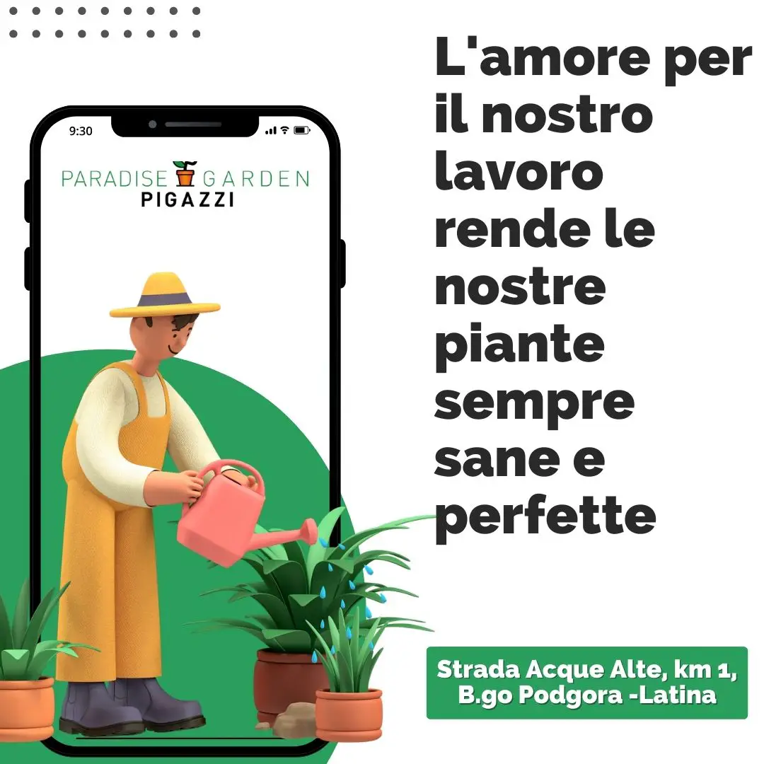 PARADISE GARDEN PIGAZZI viene aperto nel 2021, realizzato a 3 km dall’ azienda di produzione precisamente a B.go Piave frazione di Latina, si estende su un area di 32000 mq divisi in 2500 mq coperti e 1500 esterni. In tutto si contano oltre 1.000 articoli esposti tra piante da interno, piante da esterno, agrumi dalla Sicilia, piante dal Marocco, Spagna e Olanda. Accessori, vasi e terricci delle migliori marche.